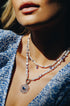 9kt white gold necklace set with Pearls (53.48ct), blue Agate (23.15ct), and Tanzanites (8.98ct).