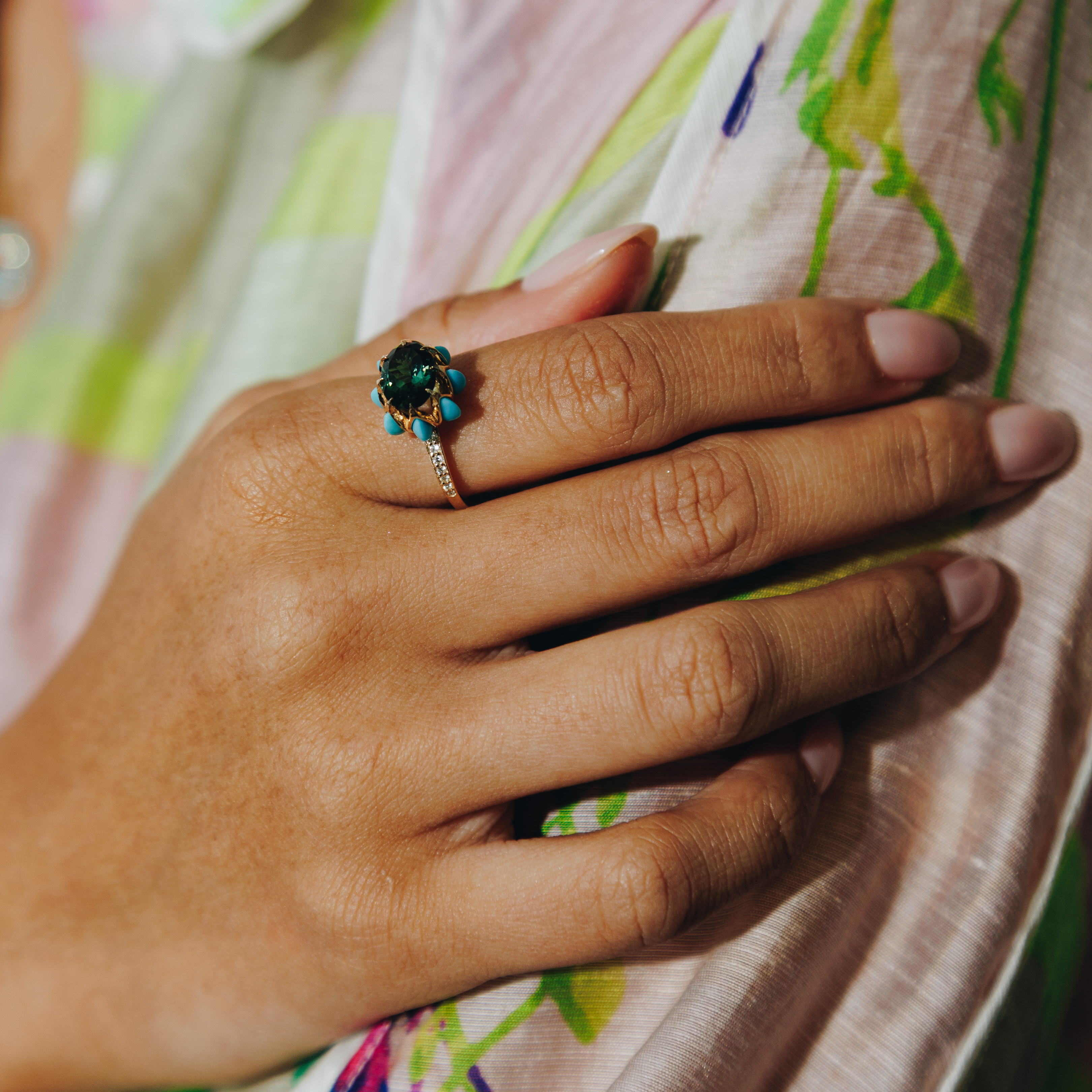 14kt yellow gold ring set with an oval green Tourmaline (1.74ct), eight marquise Turquoises (1.42ct), and fourteen round brilliant-cut Diamonds (0.09ct).