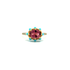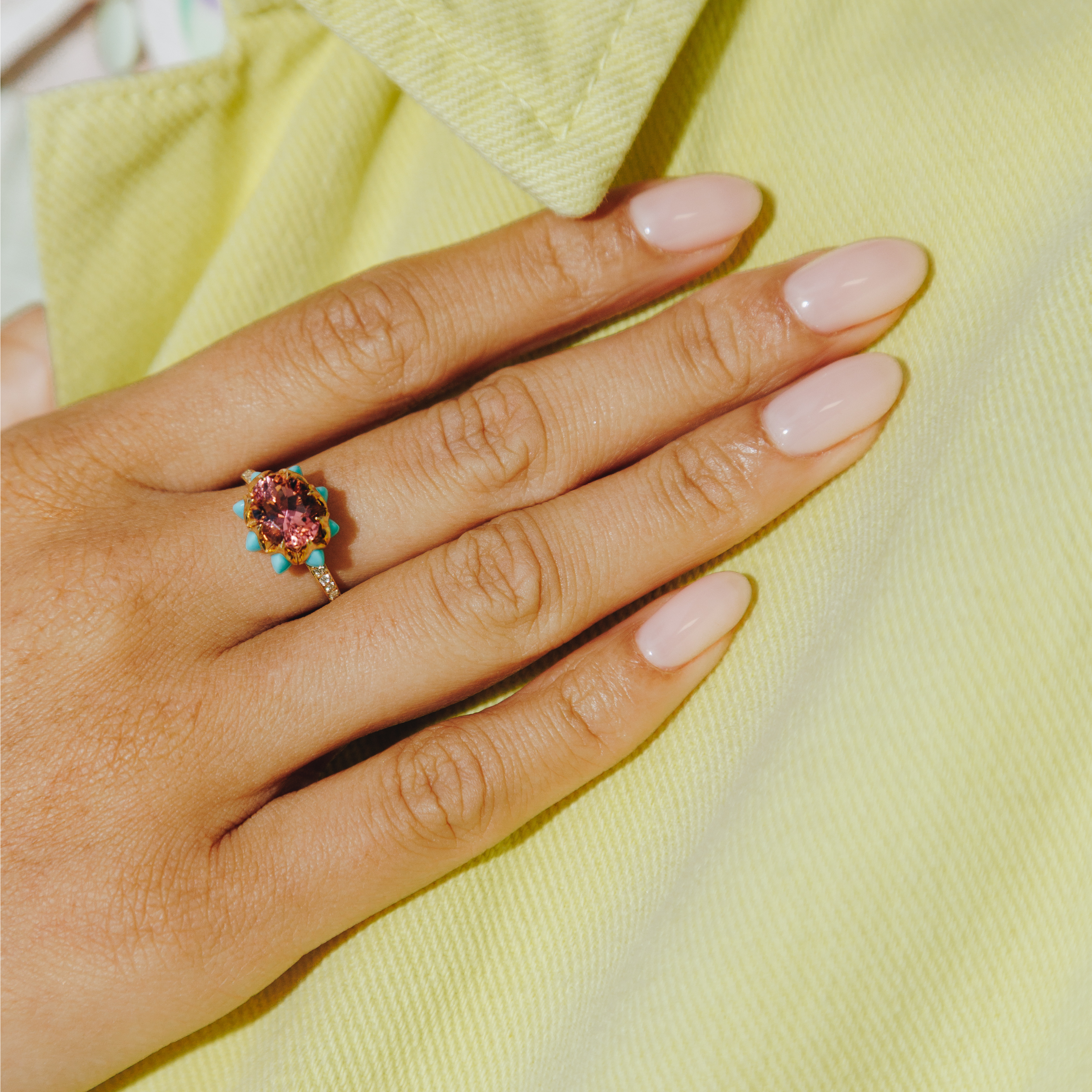 14kt yellow gold ring set with an oval pink Tourmaline (1.57ct), eight marquise Turquoises (1.42ct), and fourteen round brilliant-cut Diamonds (0.09ct).