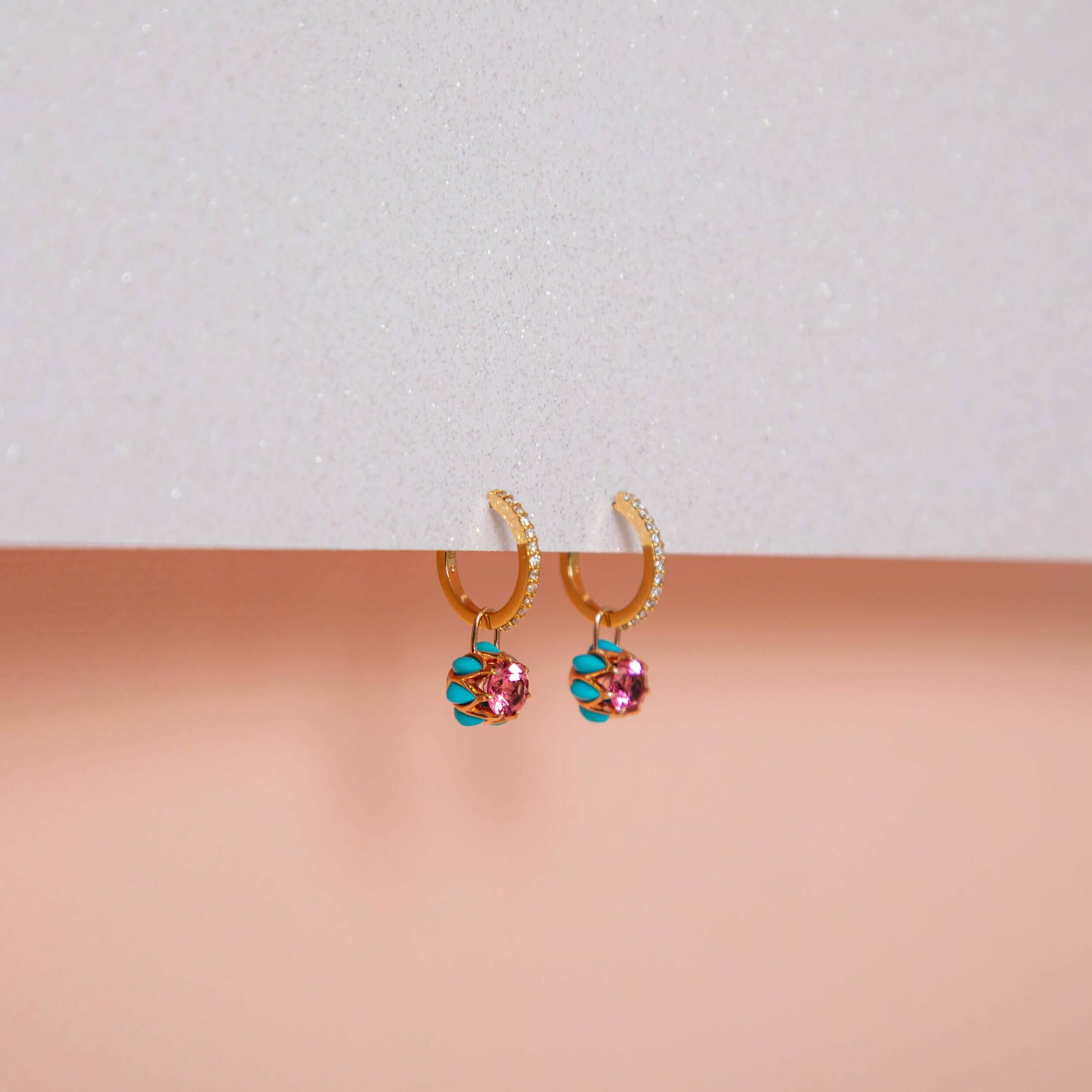 14kt rose gold Protea charms set with 1.88ct pink Tourmaline and 1.82ct Turquoise.